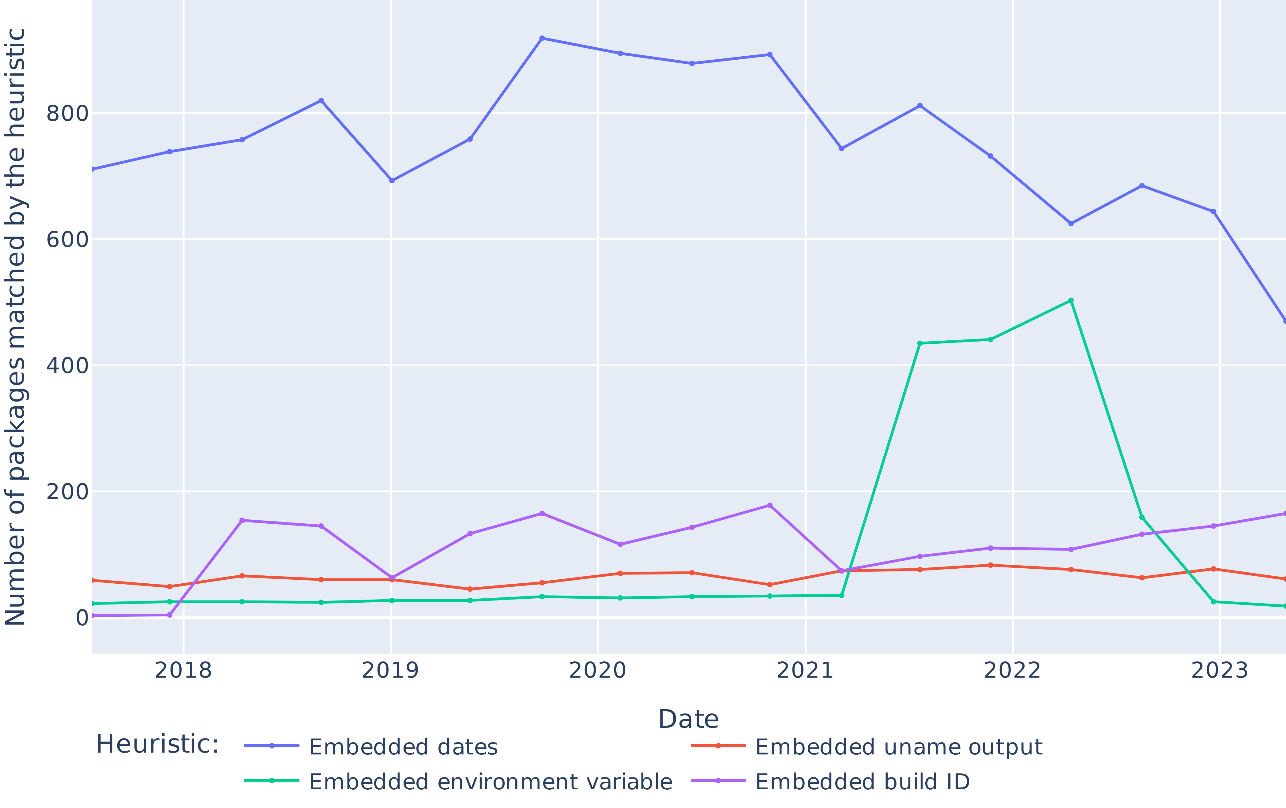 RQ1: What is the evolution of bitwise reproducible packages in nixpkgs between 2017 and 2023?