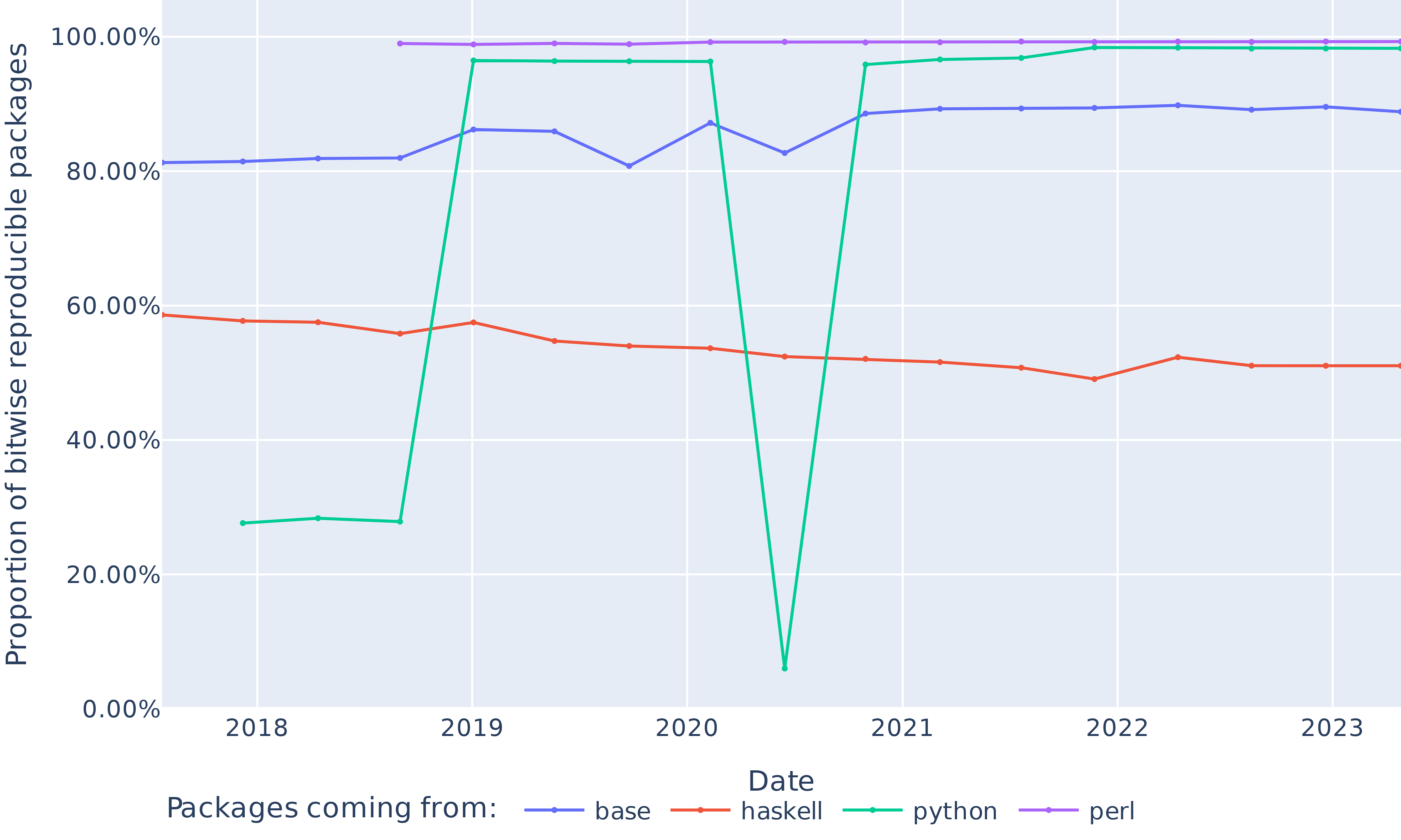 Figure 11: Proportion of reproducible packages belonging to the three most popular ecosystems and the base namespace of nixpkgs.