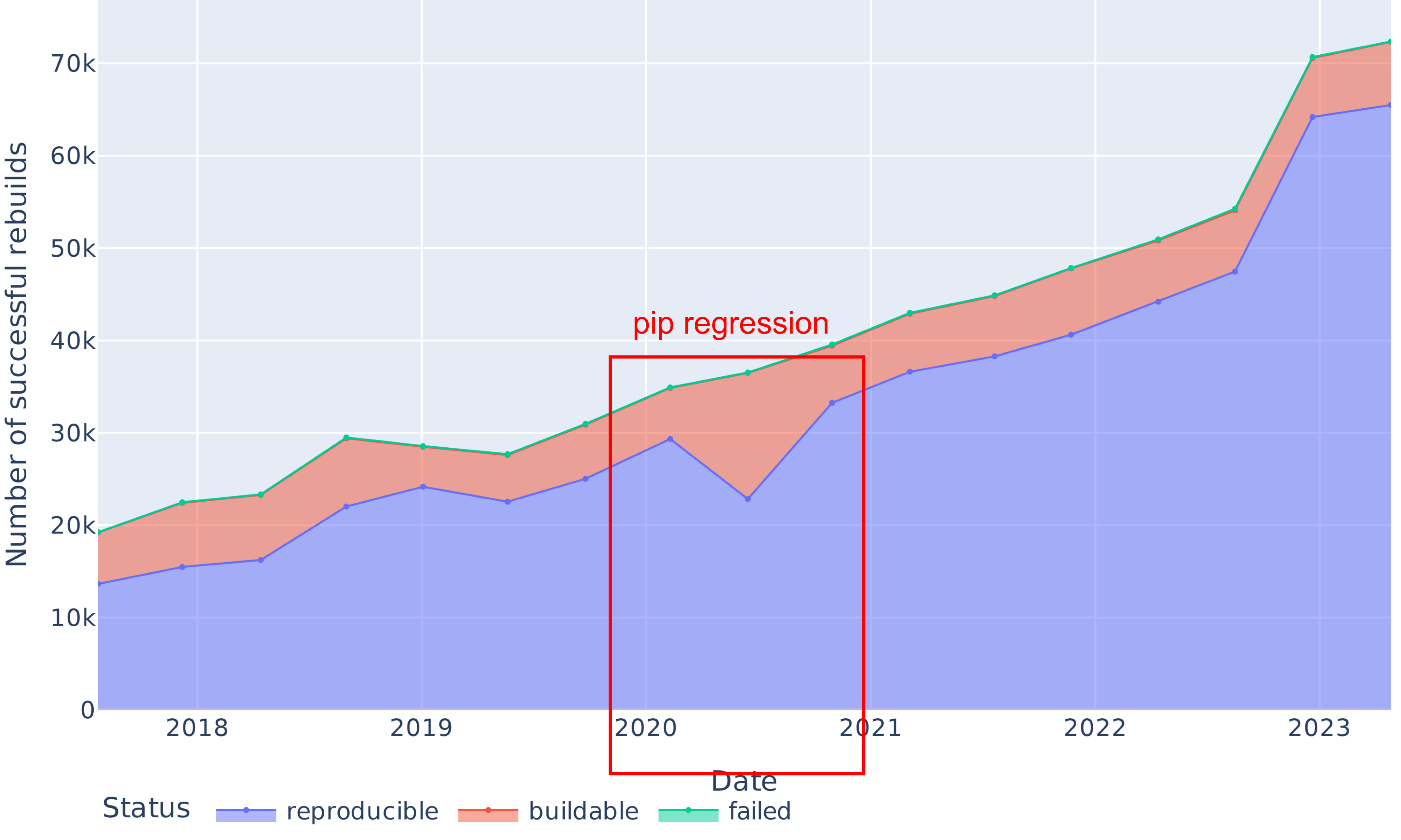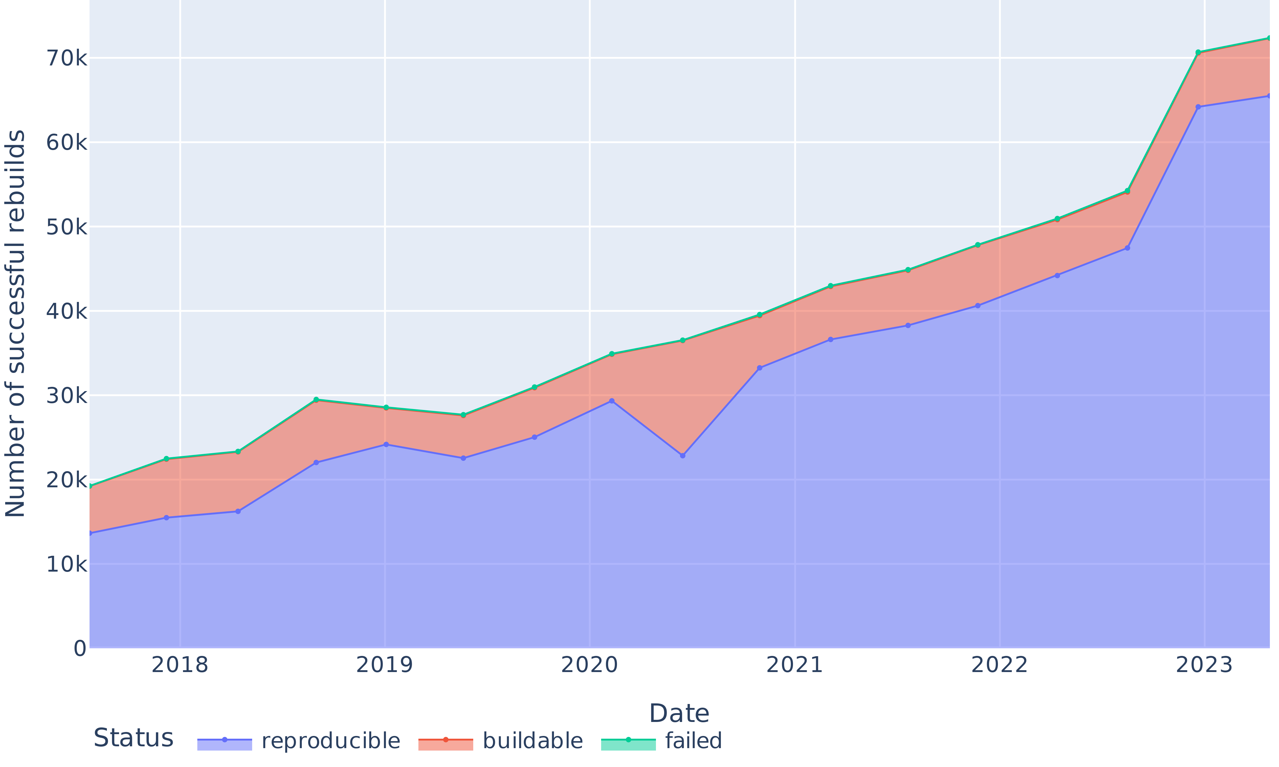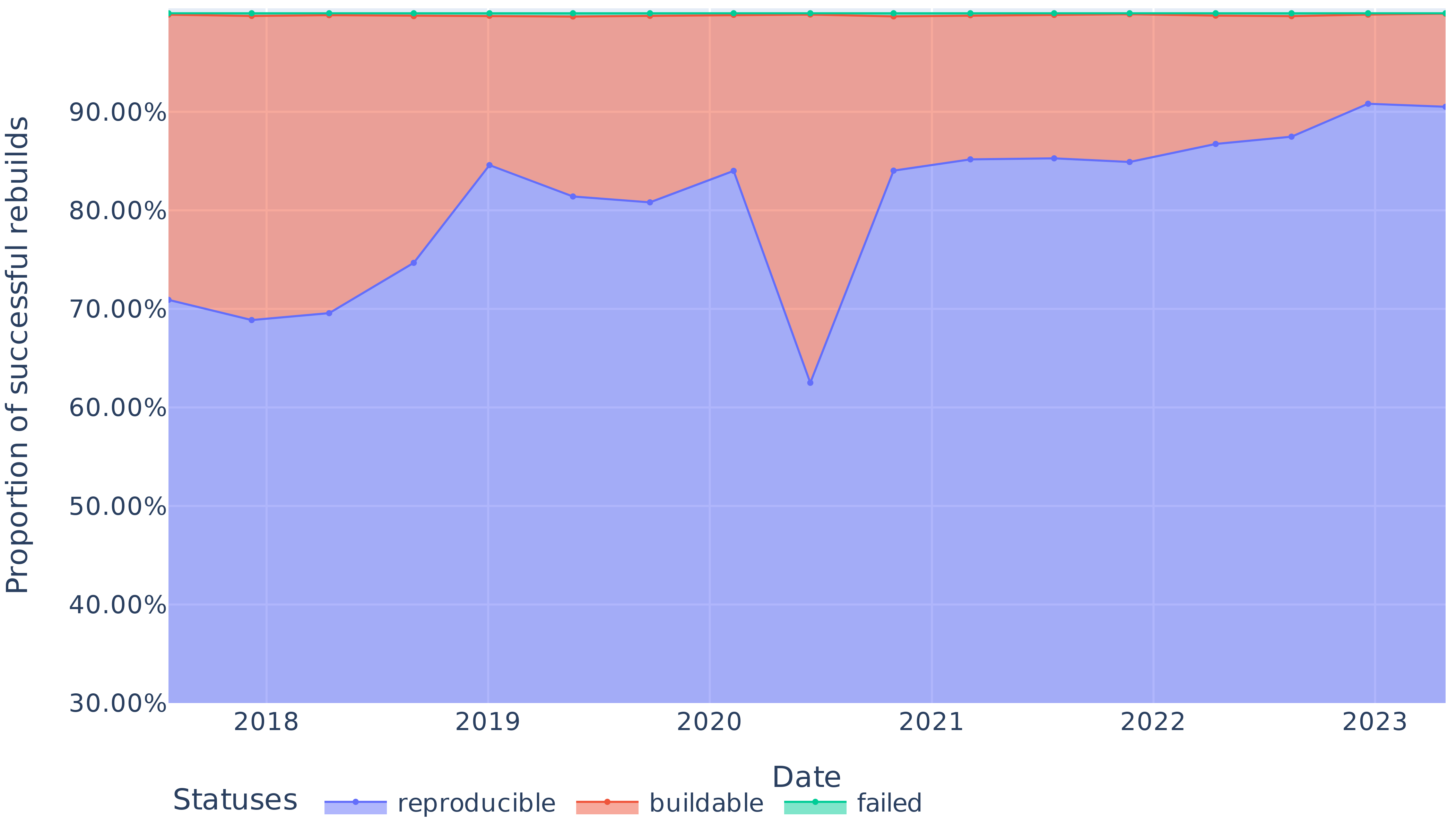 Figure 8: Proportion of reproducible, rebuildable and non-rebuildable packages over time.